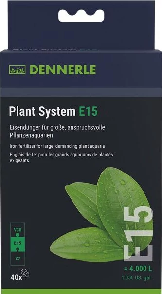 A Dennerle Plant System E15 100 darabos kiszerelése egy vas alapú tablettás műtrágya akváriumi növények számára, amelyet kifejezetten a vas hiány megelőzésére és kezelésére fejlesztettek ki. A vas központi szerepet játszik a klorofill (levélzöld) képződésében, ami nélkül a növények nem tudnak fotoszintetizálni, és vashiány esetén a fiatal levelek sápadttá, sárgássá (vasklorózis) válhatnak. Vas-műtrágya, tabletta formájában. Nem gyökértáp, hanem a vízen keresztül adagolandó táplálékkiegészítő.