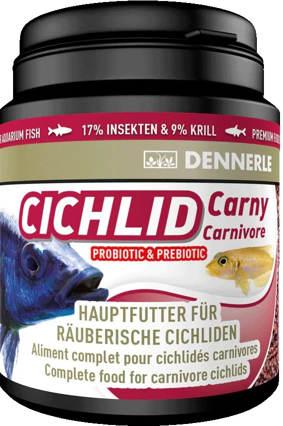A Dennerle Cichlid Carny granulátum egy fehérjében gazdag főtáp, amelyet kifejezetten afrikai és dél-amerikai, elsősorban húsevő és mindenevő sügerek számára fejlesztettek ki. A granulátum optimális táplálékot biztosít az egészséges növekedéshez, a színek intenzitásához és az immunrendszer erősítéséhez.