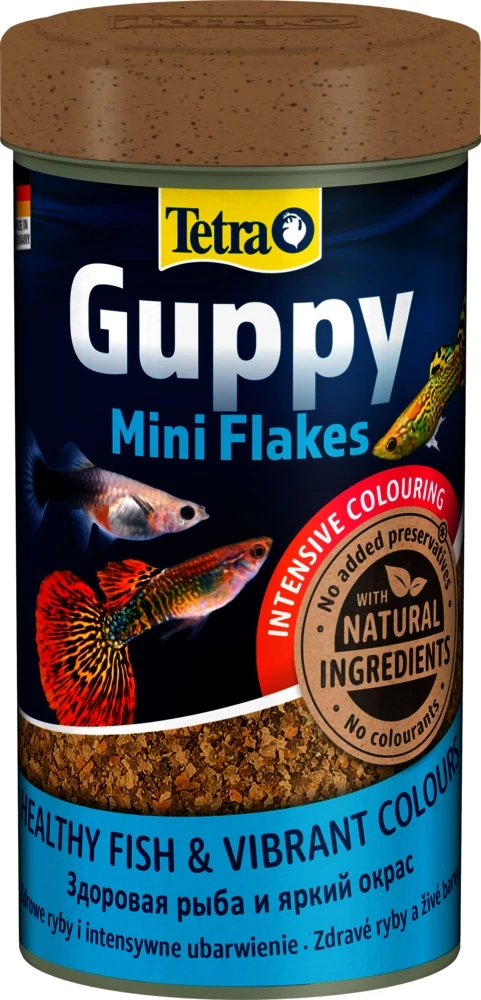 A Tetra Guppy Mini Flakes egy teljes értékű táp a guppik és más elevenszülők, például a Plattik, Mollik és kardfarkúak etetéséhez. A mini táplemezek rövid ideig először a vízfelszínen lebegnek, és csak azután merülnek el lassan, így kifejezetten alkalmasak a víz felső régiójában evő halfajták számára. A táplemez mérete igazodik a halak apró szájához, így könnyebben hozzájutnak az eledelhez. A tápanyagok speciális összetétele gondoskodik róla, hogy a halak minden szükséges tápanyaghoz hozzájussanak. Az eledel növényi összetevőkben gazdag, és hozzáadott ásványi anyagokat tartalmaz. Ennek köszönhetően szívesen fogadják a halak, továbbá elősegíti azok fejlődését. A természetes növényi színélénkítők erősítik a színezet élénkségét, míg a Bio-Active formula segít megőrizni az immunrendszer egészségét. A kiváló minőségű természetes alapanyagokat tartalmazó, színezőanyagoktól és hozzáadott tartósítószerektől mentes egyedi receptúra és az optimálisan összeállított fehérje-keverék elősegíti az ideális növekedést és a fokozott ellenálló képességet. A Tetra Guppy Mini Flakes haltápnak köszönhetően díszhalai szépen fejlődnek, az akvárium vize pedig tiszta és áttetsző marad.
