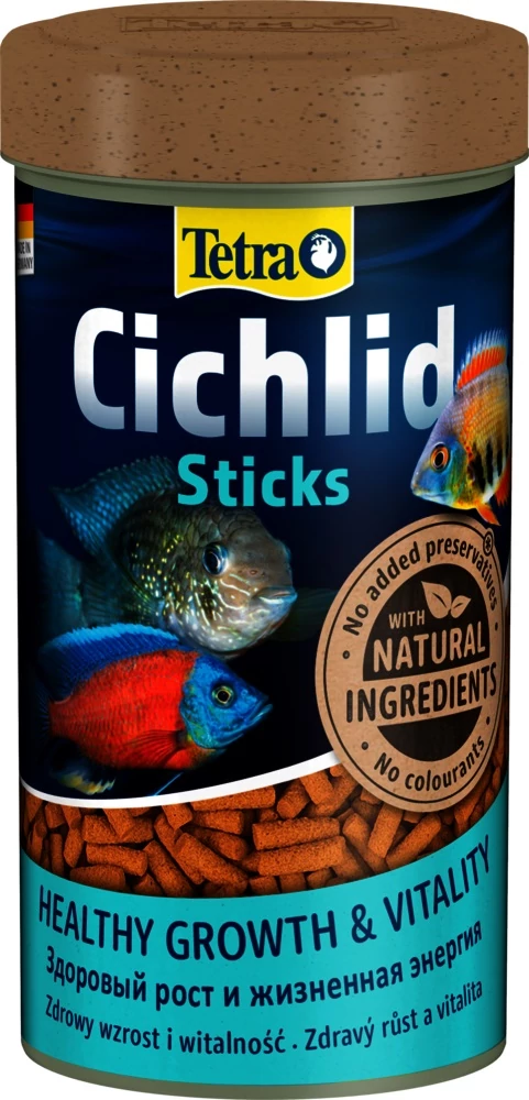 A Tetra Cichlid Sticks egy kiváló minőségű, teljes értékű, pálcikás kiszerelésű haltáp, amely kifejezetten a sügérek és más nagytestű díszhalak egészséges és kiegyensúlyozott táplálására lett kifejlesztve. Tápanyagtartalma kielégíti a sügérek megnövekedett állatifehérje-szükségletét, és természetes, kiegyensúlyozott táplálkozást biztosít. A víz felszínén lebegő pálcikák a férgekre hasonlító méretüknek és alakjuknak köszönhetően jól illeszkednek a halak természetes táplálkozási szokásaihoz. A kiváló minőségű természetes alapanyagokat tartalmazó, színezőanyagoktól és hozzáadott tartósítószerektől mentes egyedi receptúra, valamint az optimálisan összeállított fehérjekeverék elősegíti az ideális növekedést és a fokozott ellenálló képességet. A speciálisan összeállított haleledel tápanyagtartalma a sügérek magas állati fehérje igényének megfelelő, így a természetesnek megfelelő módon látja el őket tápanyagokkal, vitaminokkal és nyomelemekkel. A szabadalmaztatott bio-aktív formula elősegíti, hogy a halak egészségesen és sokáig éljenek.  A Tetra Cichlid Sticks haltápnak köszönhetően sügérjei szépen fejlődnek, a haltáptól pedig tiszta és áttetsző marad az akvárium vize.