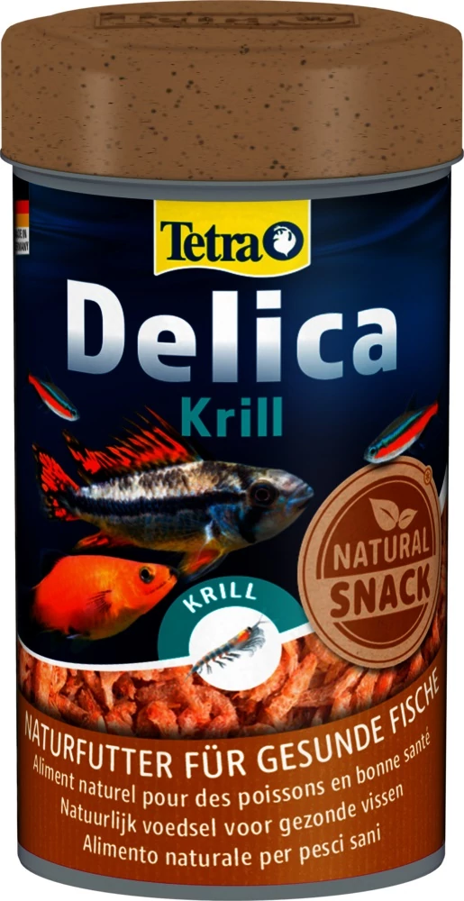 A Tetra Delica Krill tökéletes csemege két etetés között, mert a segítségével kapcsolatot teremthetünk a díszhalakkal az élménydús etetésük közben. Ez az ízletes csemege 100 százalékban egész, gondosan fagyasztva szárított rákféléket tartalmaz. A kíméletes, vitaminokat megőrző szárítási folyamat optimális minőséget és a magas tápértéket biztosít a halaknak. Ezen eljárás miatt a Tetra Delica Krill a különféle élő és fagyasztott eledelek egészséges és biztonságos alternatívája. A vízben megjelenő vízibolhák hasonlítanak az eredeti természeti viszonyokra. Emiatt a halak könnyen elfogadják és szívesen fogyasztják, miközben tökéletesen kiegészítik az olyan teljes értékű eledeleket, mint amilyen a Tetra Min.