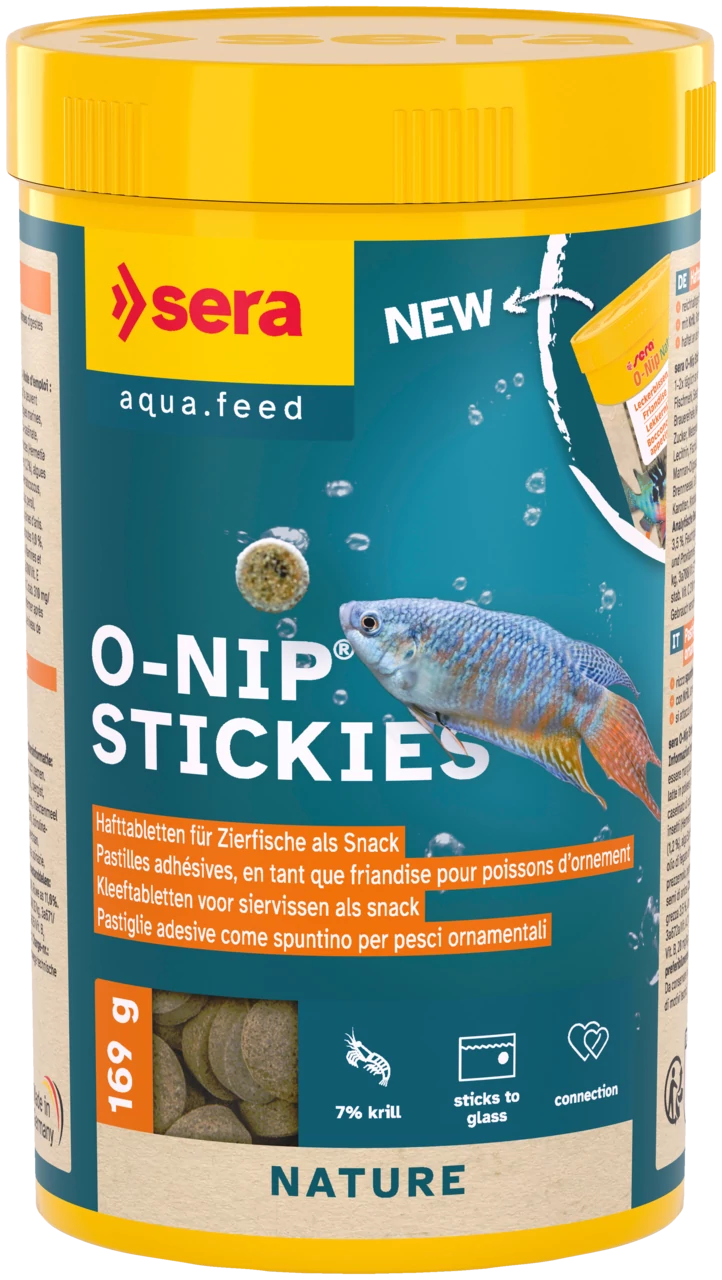 Az O-nip Stickies egy színezék- és tartósítószermentes jutalomfalat, amely gondosan gyártott fülecskékből áll, és enyhe ujjnyomással tapad az akvárium üvegéhez.  Népszerű tablettás haleledel valamennyi tenger- és édesvízi hal számára. Húsevő díszhalak különösen szeretik. 50 %-ban nagyértékű lemezes táplálékból (Sera Vipan), 50 %-ban mélyfagyasztással szárított táplálékállatokból áll. Az eledel még a félős, elbújó halakat is előcsalogatja, mikor megérzik az akvárium üvegére tapadt aromás illatú tápot.