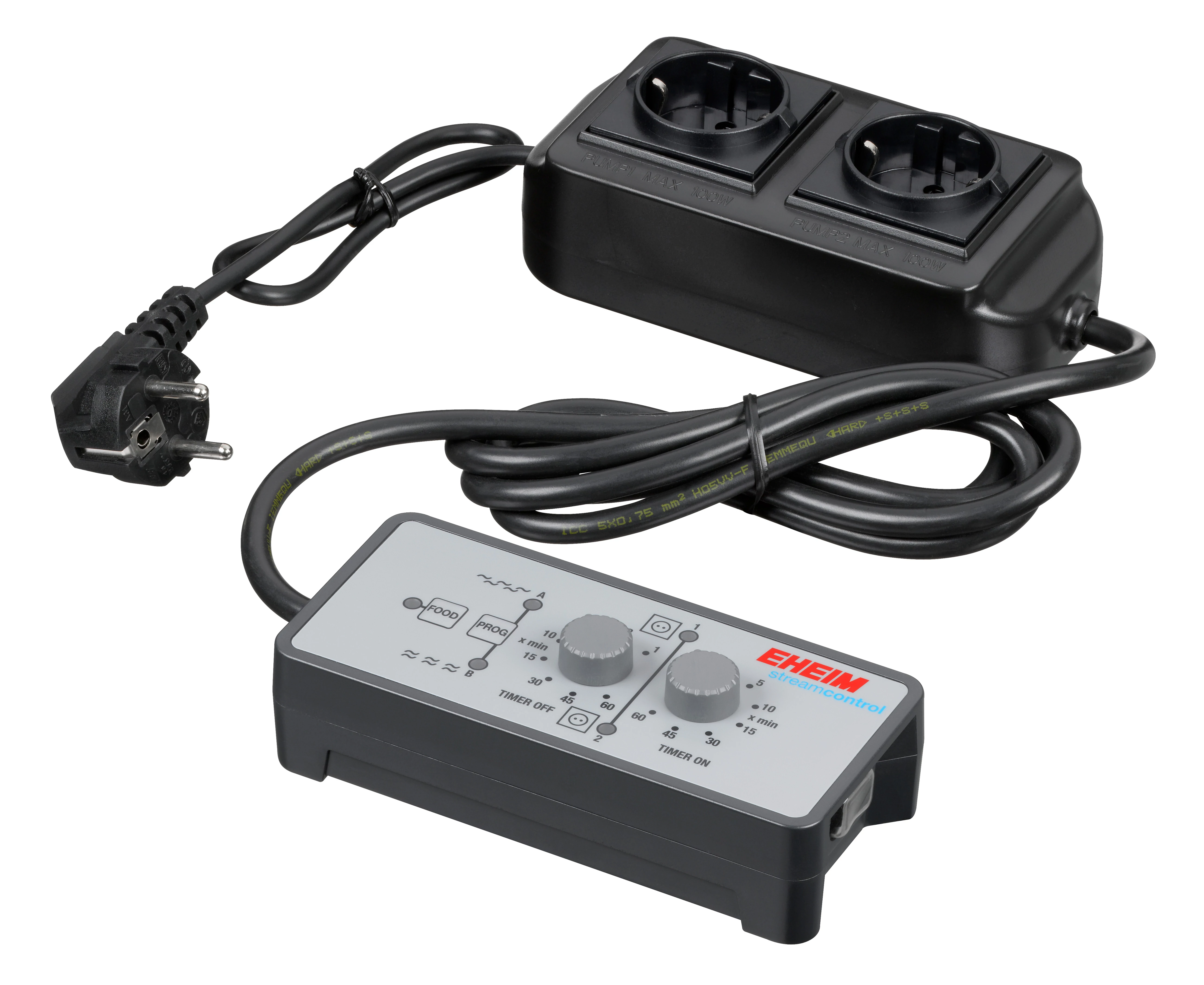 Az Eheim streamcontrol ideális megoldást kínál. Egyszerűen csatlakoztassa a szivattyú hálózati csatlakozó dugóit a mellékelt dupla csatlakozó aljzatba, kapcsolja be a készüléket, majd állítsa be az áramlási időközöket. Két program áll rendelkezésre: a) váltakozó szivattyú frekvencia és b) szinkronszivattyú frekvencia. Egyszerűen határozza meg az időintervallumokat két tárcsával.