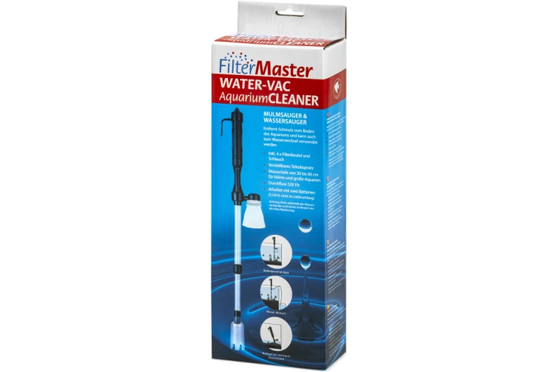 Állítható teleszkópos csövével a Water-Vac 20-60 cm-es vízmélységű akváriumokhoz alkalmas. A porszívó 520 l/h vízáramlást biztosít, és bárhol használható a vezeték nélküli akkumulátoros működésnek köszönhetően (2 x Type C / LR14 Baby). Az elemeket nem tartalmazza.