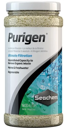Seachem Purigen egy elsőosztályú szintetikus adszorbens, ami nem hasonlít semmilyen más szűrőanyaghoz. Adszorptív szűrőanyag édesvizi- és tengeri akváriumokhoz. Ez nem egy ion cserélő vagy adszorbens keverék, hanem egy speciális makroporózus szintetikus polimer, ami eltávolítja az oldható és feloldhatatlan szennyeződéseket a vízből. Mindezt minden más szűrőanyagnál jobb hatásfokkal és rövidebb idő alatt. A Purigen szabályozza az ammóniát, nitritet, nitrátot úgy, hogy eltávolítja a nitrogénes szerves szennyeződéseket. A Purigen csekély mértékben hat a trace elemekre, így növénytápokkal is használható. Kiemelkedően növeli a redukciós-oxidációs képességet.
