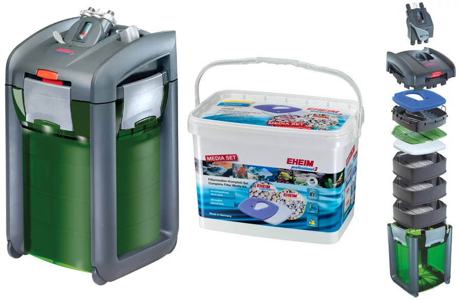 Eheim Media +: Az Eheim Professionel 3 kompletten, eredeti Eheim szűrőanyagokkal kerül forgalomba. Mechanikai szűrőanyagok: Eheim vatta szűrőbetét (fehér) 1 db, Eheim durva szivacsbetét (kék) 1 db, Eheim Mech 4 l.